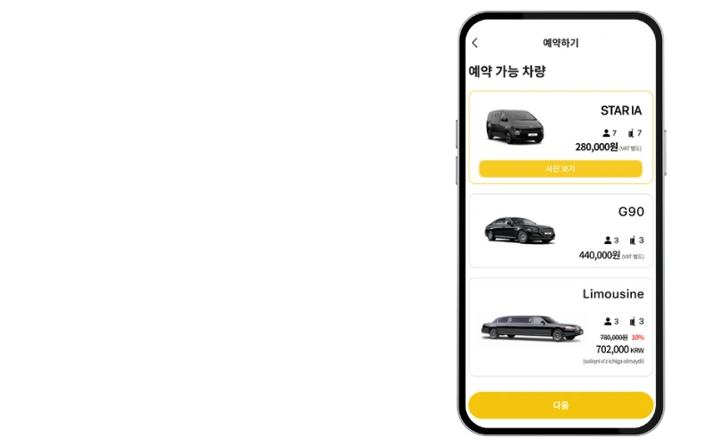 한국에 오신 것을 환영합니다. 이제 집까지의 안전한 귀가와 여행을 위한 차량(트랜스퍼)을 쉽고 편리하게 예약하실 수 있습니다.